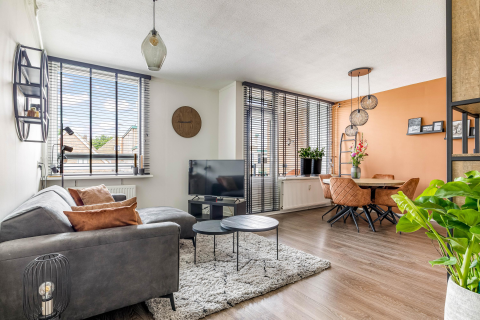 De gesloten keuken in L-opstelling biedt ruimte voor een eethoek en is uitgerust met een inductiekookplaat, combi-oven/magnetron en afzuigkap. Hoewel de keuken functioneel is, vraagt deze om een moderne update, waarmee je de ruimte helemaal naar eigen smaak kunt maken.